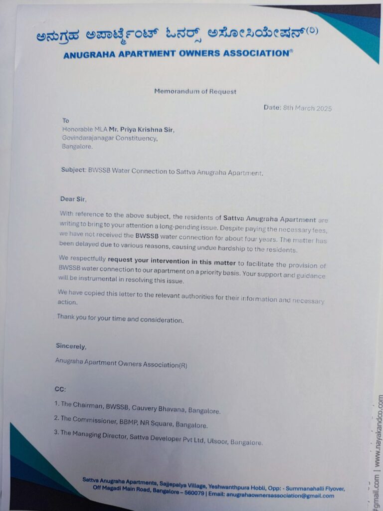 We’re pleased to inform you that Mr. Priya Krishna Sir has assured us of his support. He instructed us to re-submit our application to BBMP for road cutting to facilitate the water pipeline connection. Moreover, he personally called the concerned authorities to expedite the process and ensured that the road cutting work will commence next week.