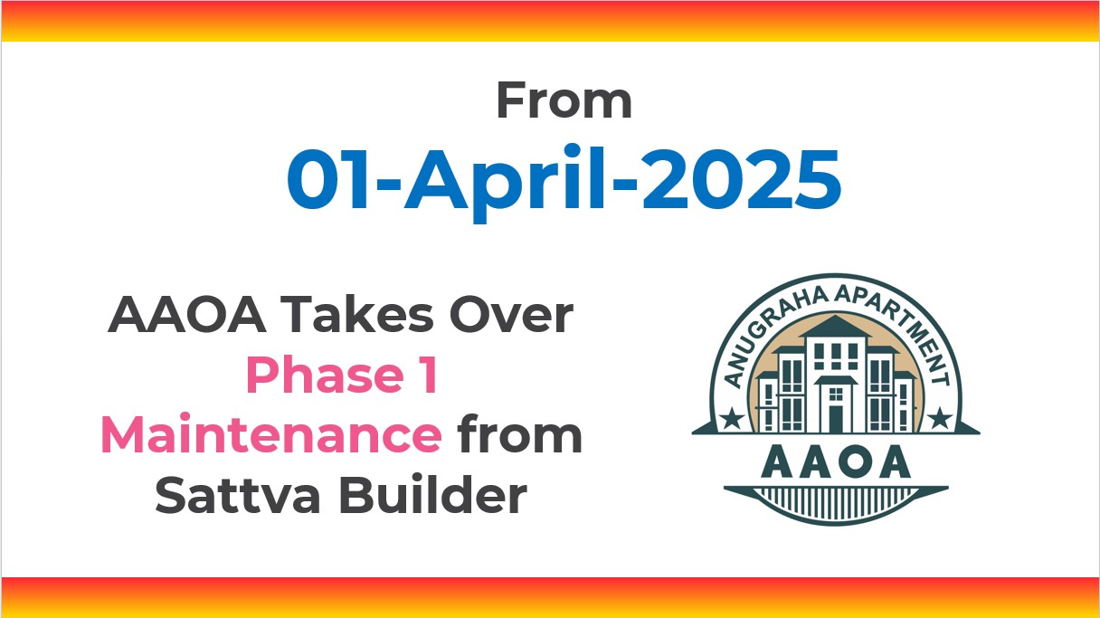 Dear Anugraha Residents, We are pleased to inform you that, as previously announced, the Anugraha Apartment Owners Association (AAOA) has officially taken over the maintenance services of our apartment complex…